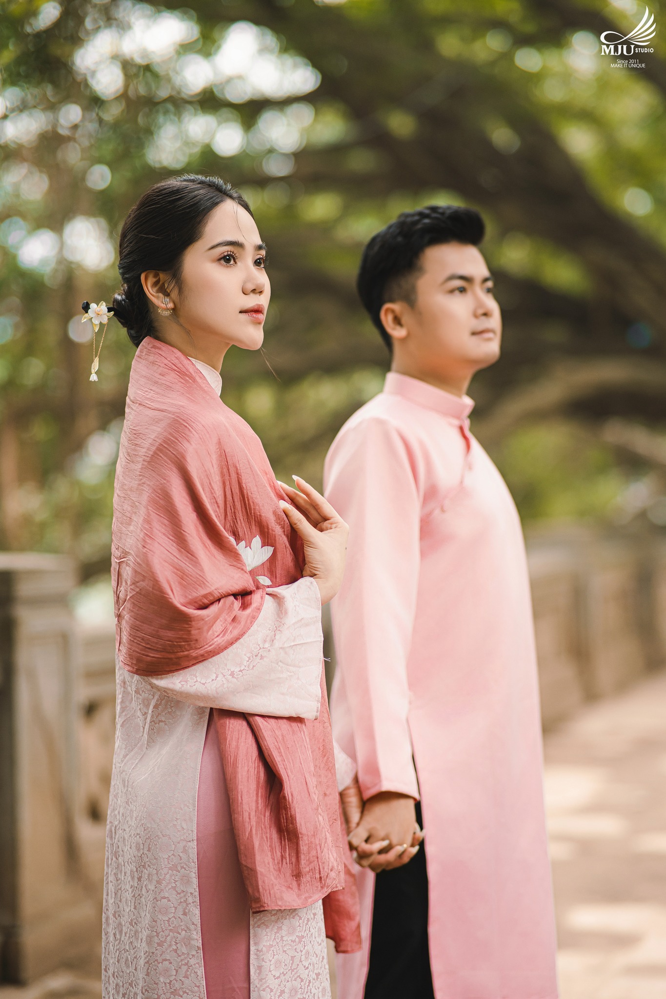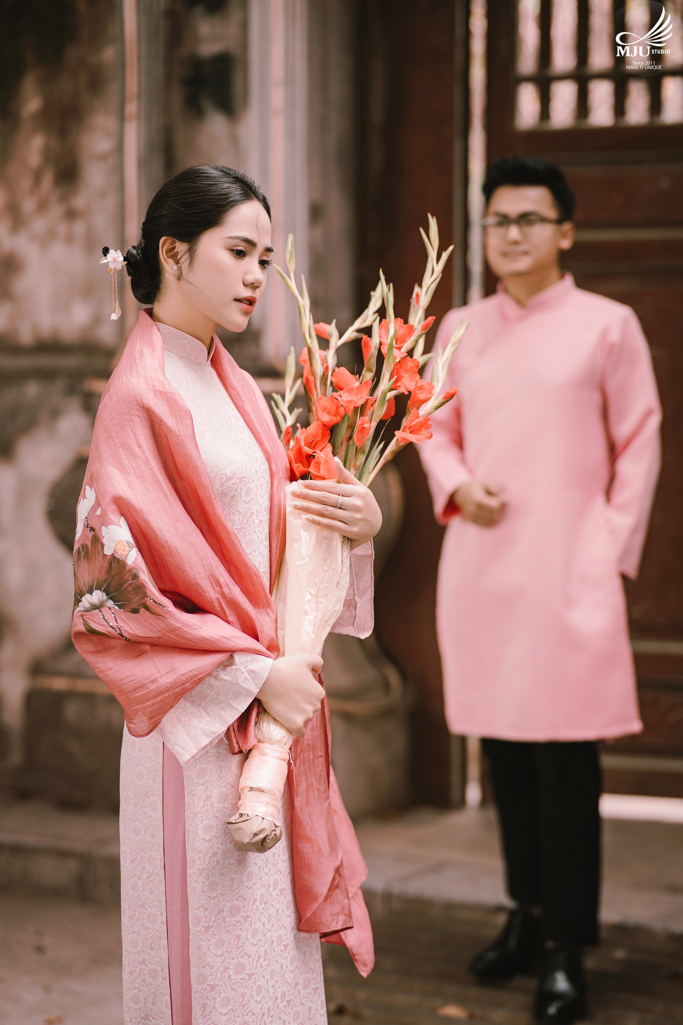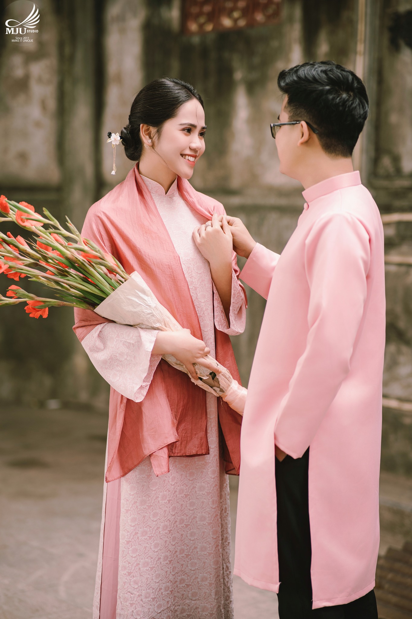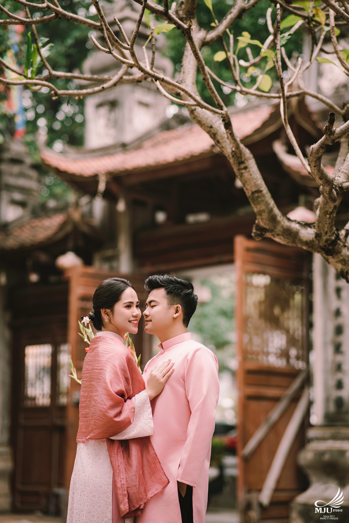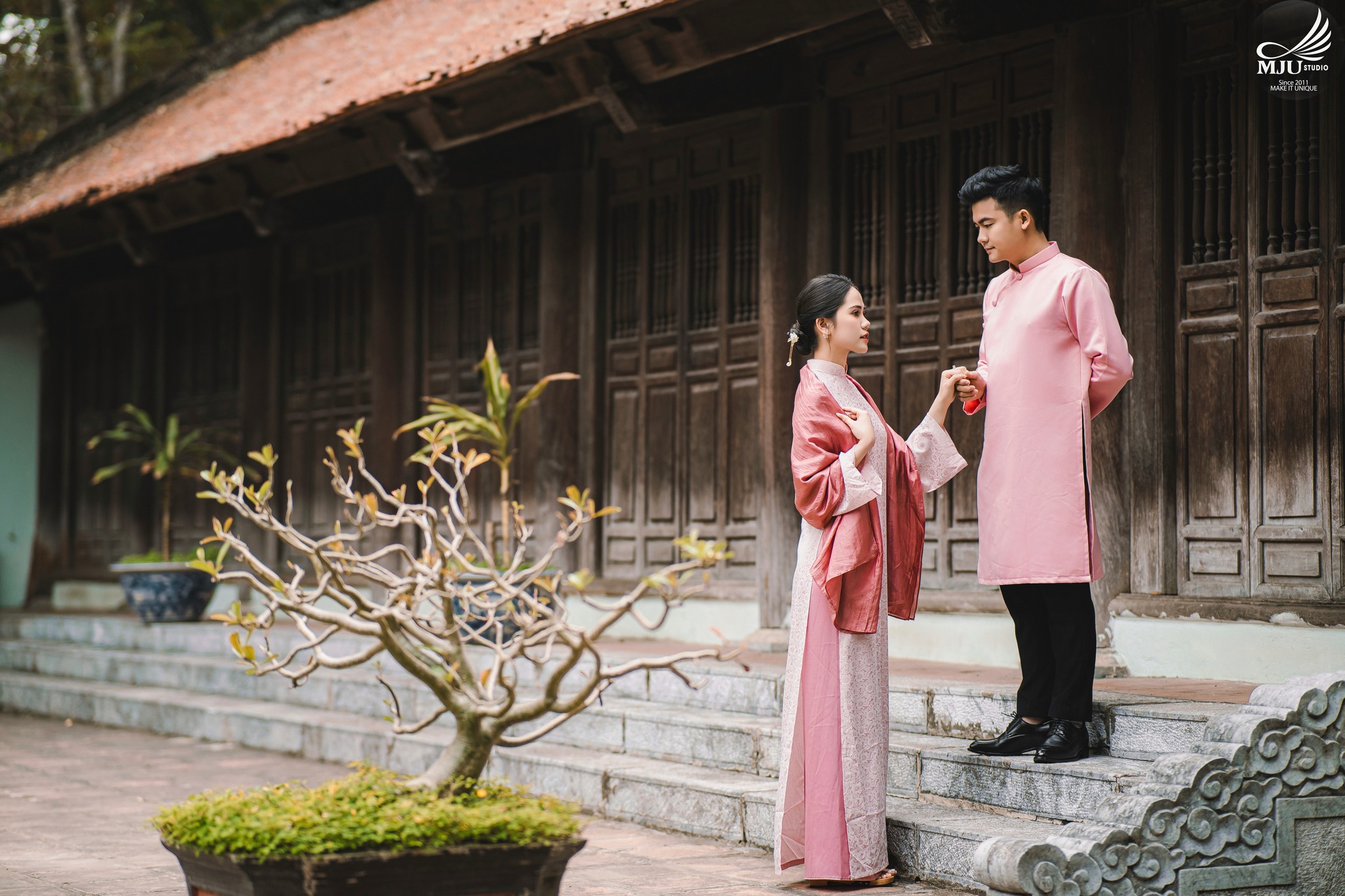 MJU Studio đã gợi ý một concept rất dung dị với tạo hình áo dài thụng cổ phục đang rất được ưa chuộng năm nay, ghi hình tại một địa điểm đậm chất Hà Nội, dưới tạo hình của Chuyên viên trang điểm MJU Studio, cô dâu Huyền đẹp tinh khôi, trong góc máy của Nhiếp ảnh gia MJU studio, cô dâu chú rể như hoà mình trong hương Vị Tết cổ truyền xưa, nhưng vẫn sang trọng, tinh tế.