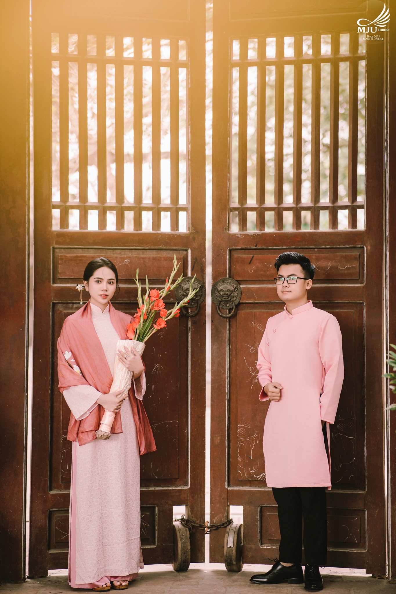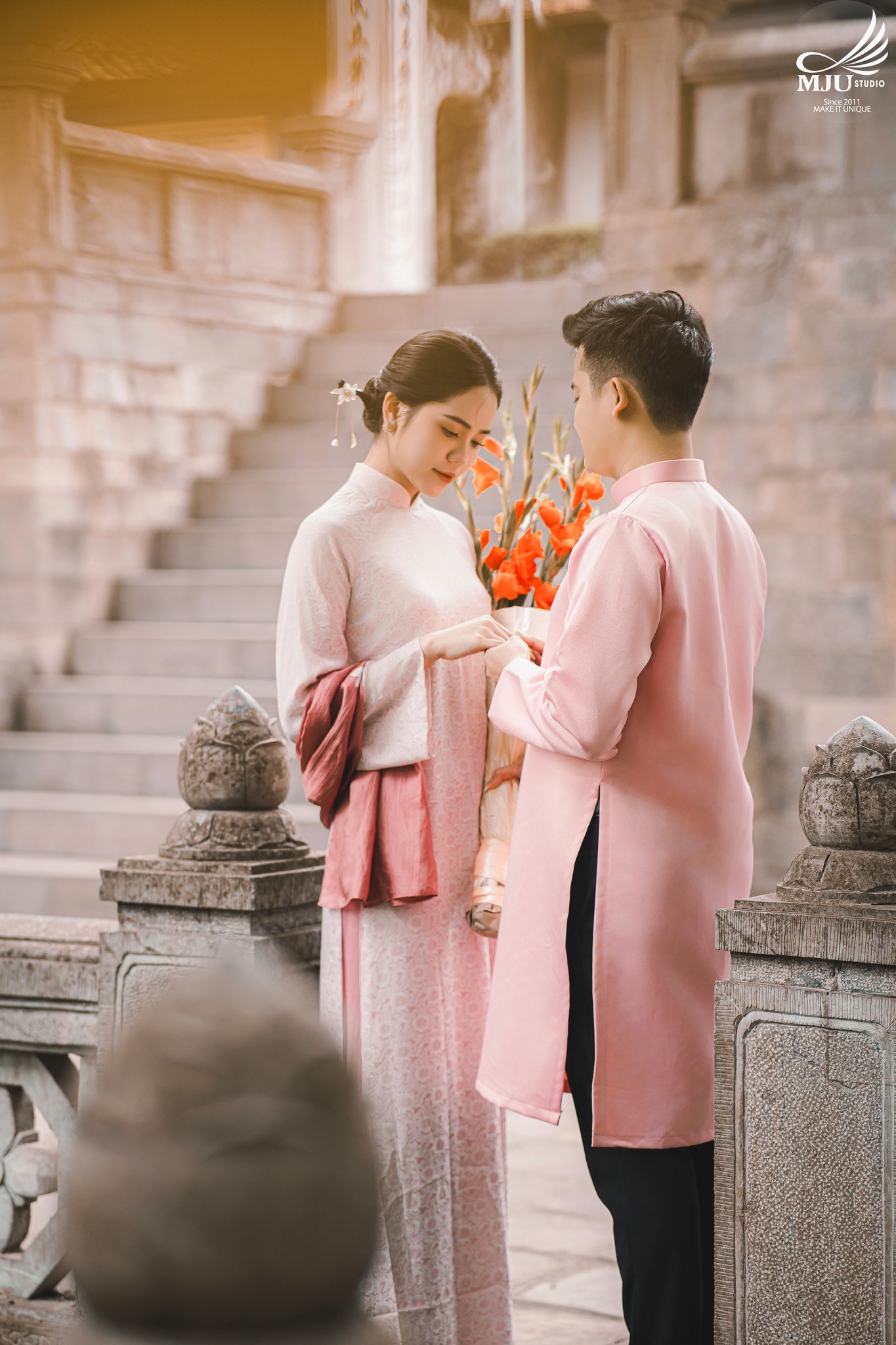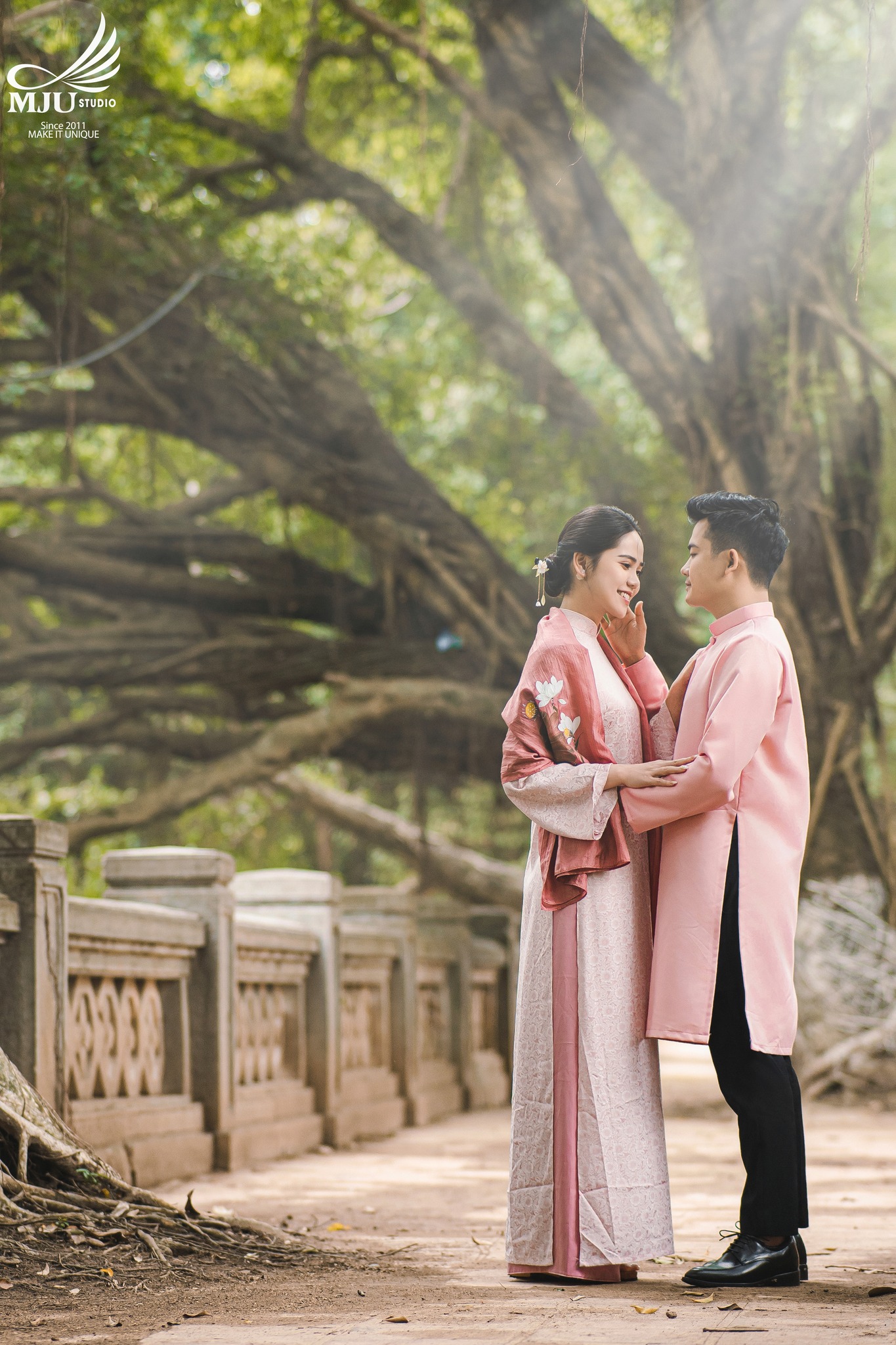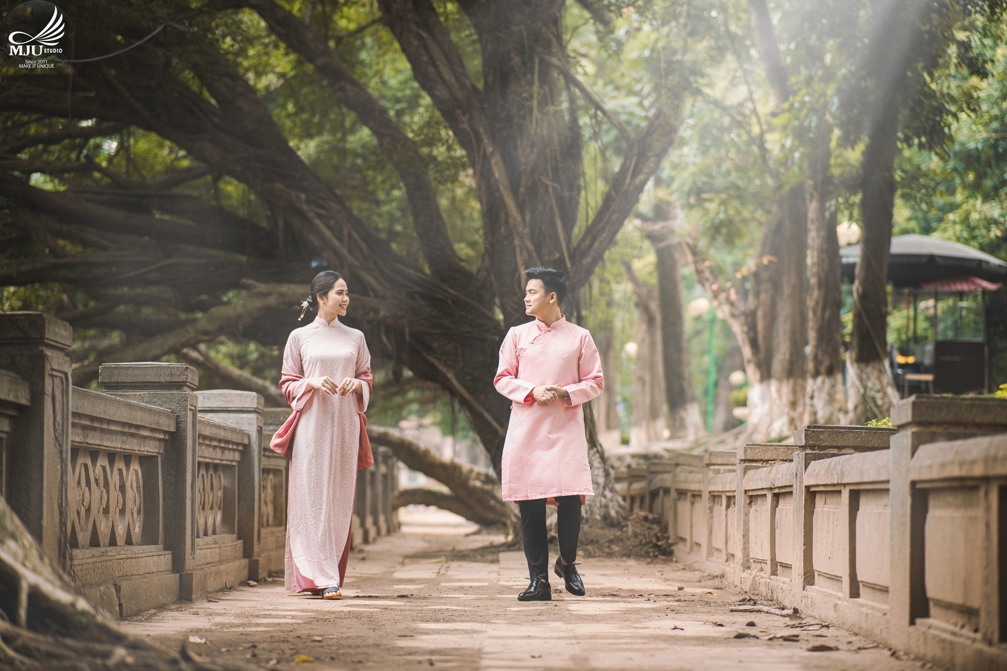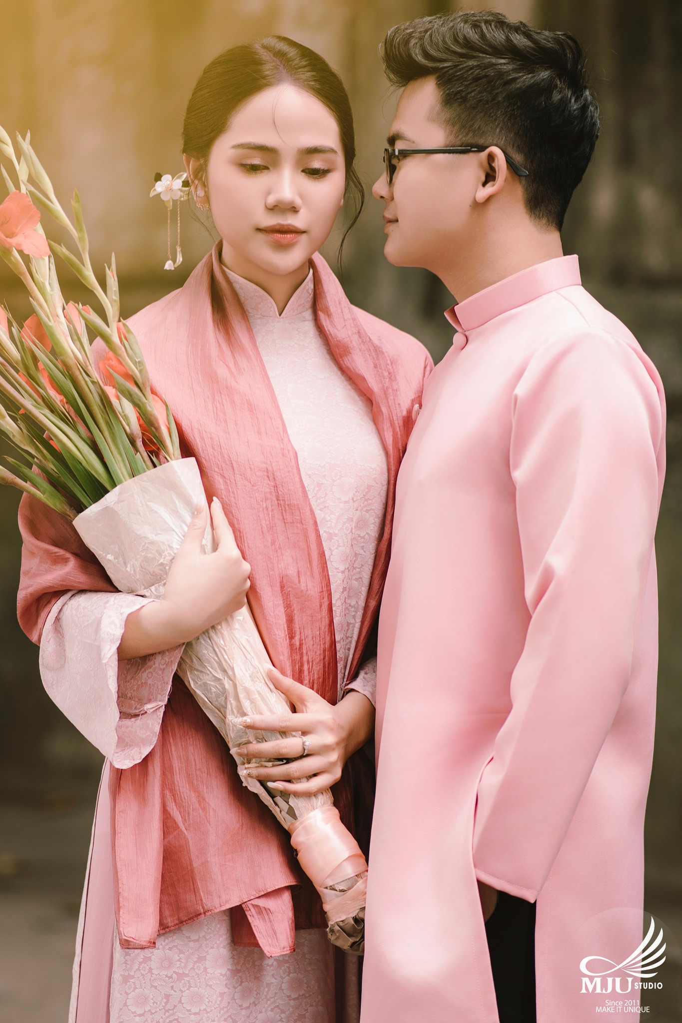 MJU Studio đã gợi ý một concept rất dung dị với tạo hình áo dài thụng cổ phục đang rất được ưa chuộng năm nay, ghi hình tại một địa điểm đậm chất Hà Nội, dưới tạo hình của Chuyên viên trang điểm MJU Studio, cô dâu Huyền đẹp tinh khôi, trong góc máy của Nhiếp ảnh gia MJU studio, cô dâu chú rể như hoà mình trong hương Vị Tết cổ truyền xưa, nhưng vẫn sang trọng, tinh tế.