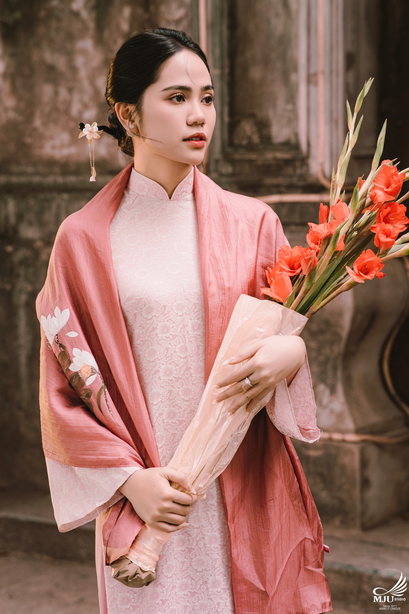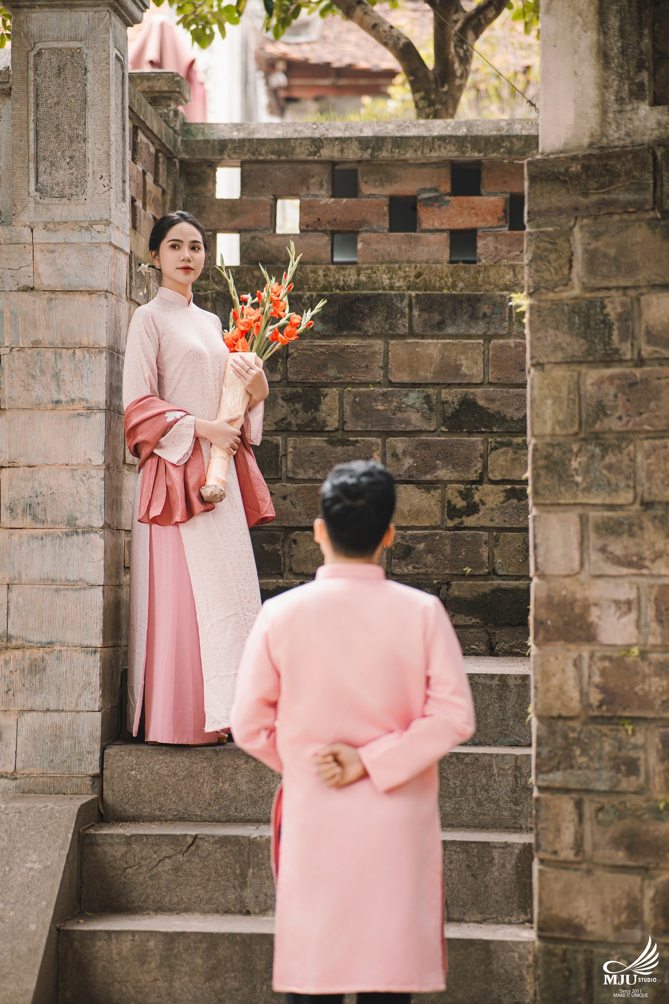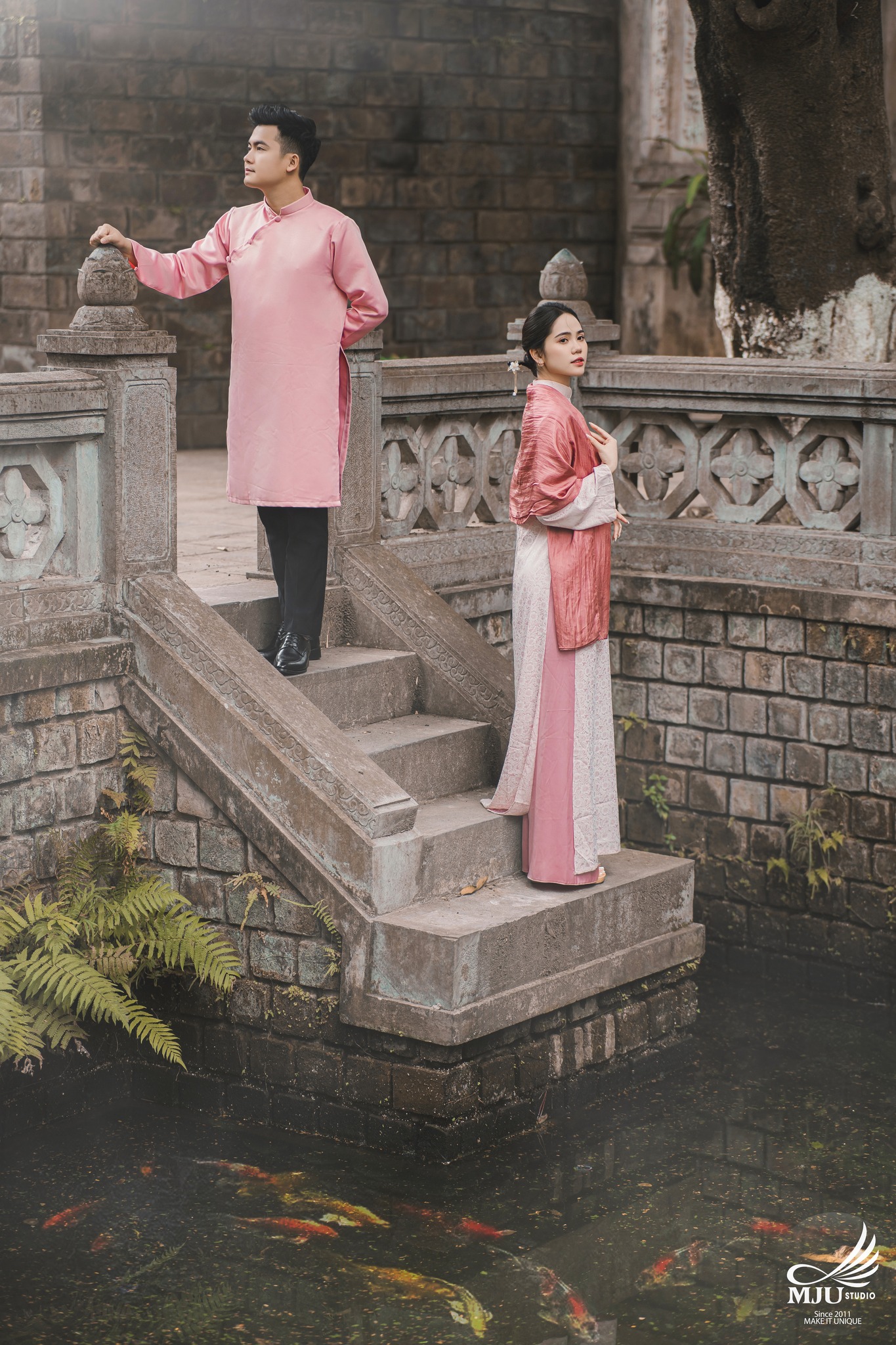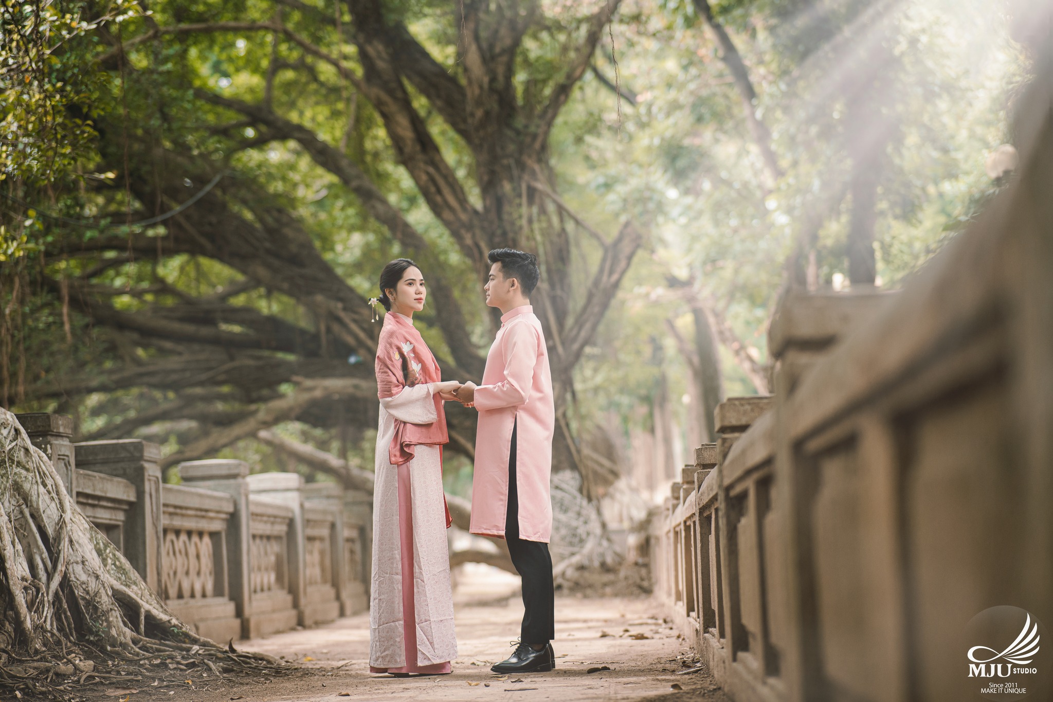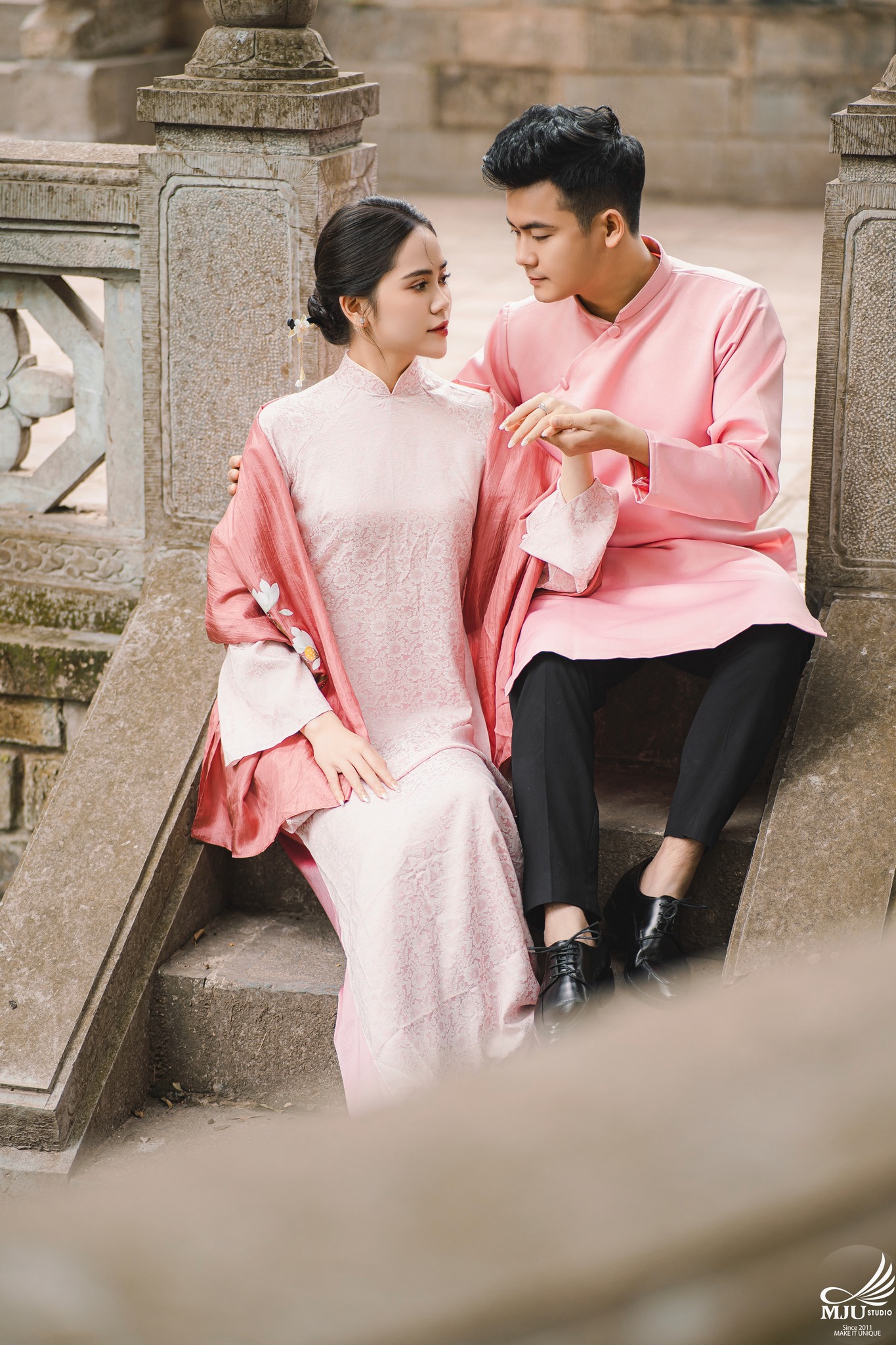 MJU Studio đã gợi ý một concept rất dung dị với tạo hình áo dài thụng cổ phục đang rất được ưa chuộng năm nay, ghi hình tại một địa điểm đậm chất Hà Nội, dưới tạo hình của Chuyên viên trang điểm MJU Studio, cô dâu Huyền đẹp tinh khôi, trong góc máy của Nhiếp ảnh gia MJU studio, cô dâu chú rể như hoà mình trong hương Vị Tết cổ truyền xưa, nhưng vẫn sang trọng, tinh tế.