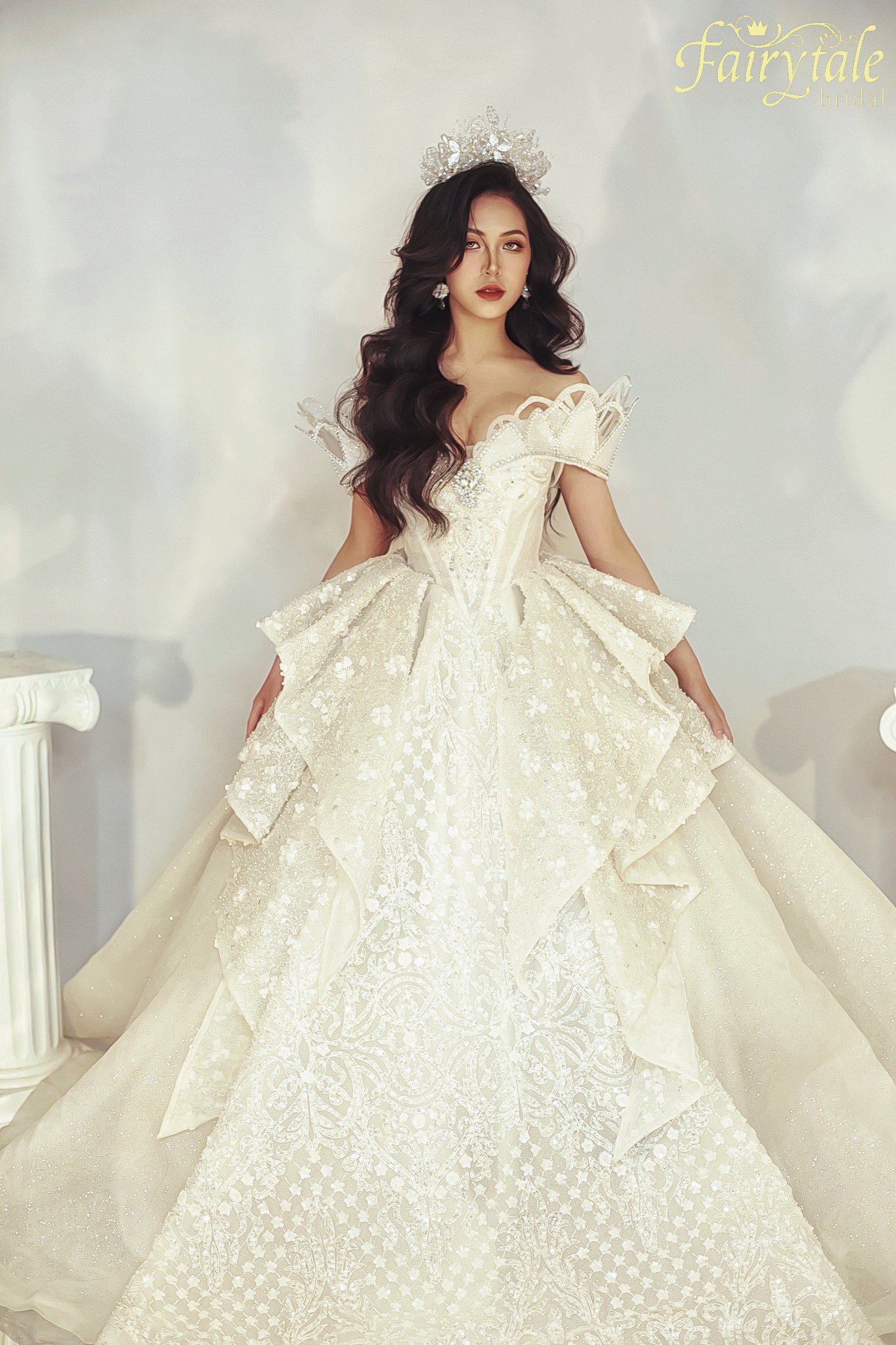 Với những dáng váy công chúa bồng xoè to, được sử dụng hoàn toàn chất liệu ngoại nhập kết hợp cùng kĩ thuật đính kết đá quý, pha lê cao cấp, mỗi chiếc váy của Fairytale Bridal đều được đánh giá cao về độ tinh xảo. Bên cạnh đó còn là kĩ thuật dựng form thân ngắn có nẹp eo corset tạo vòng eo con kiến “trong mơ” cho mỗi nàng dâu