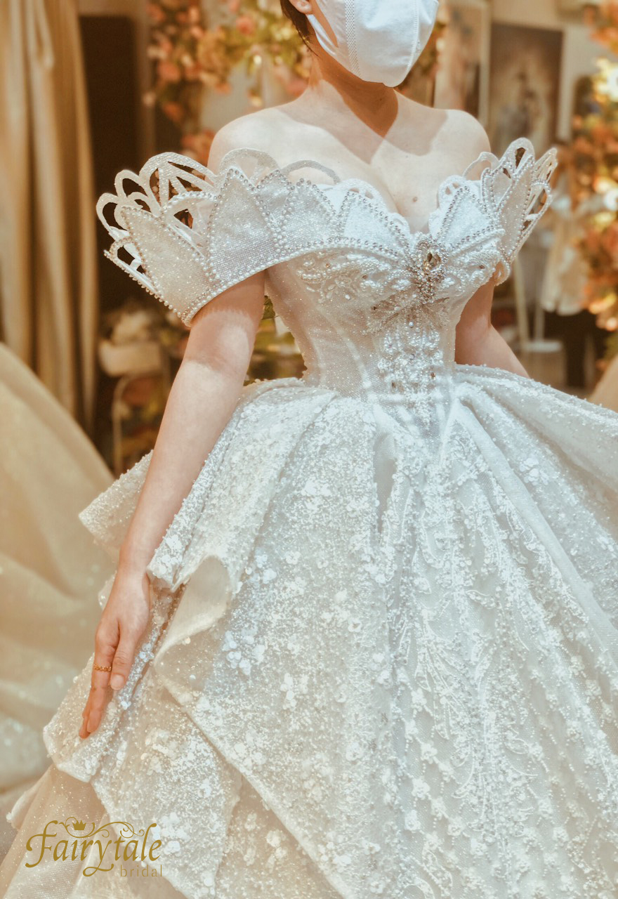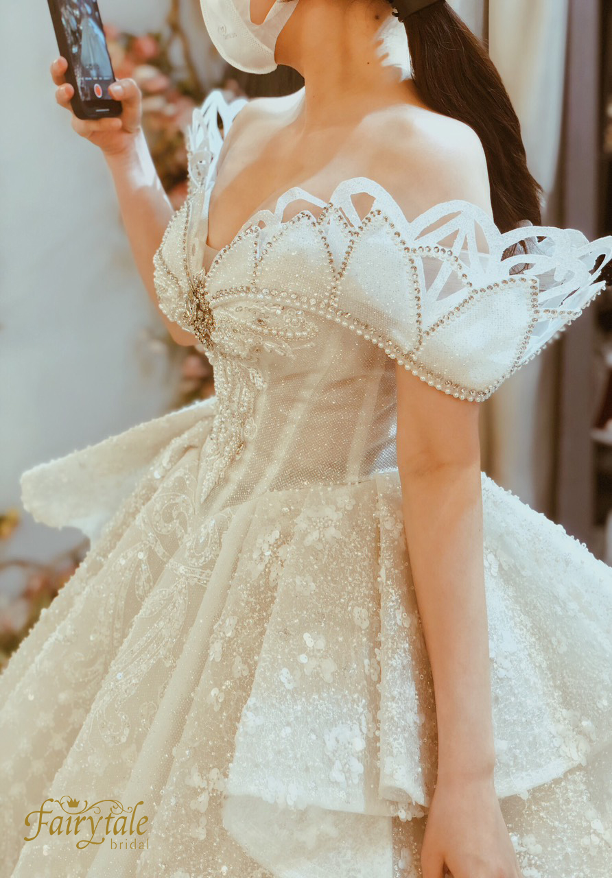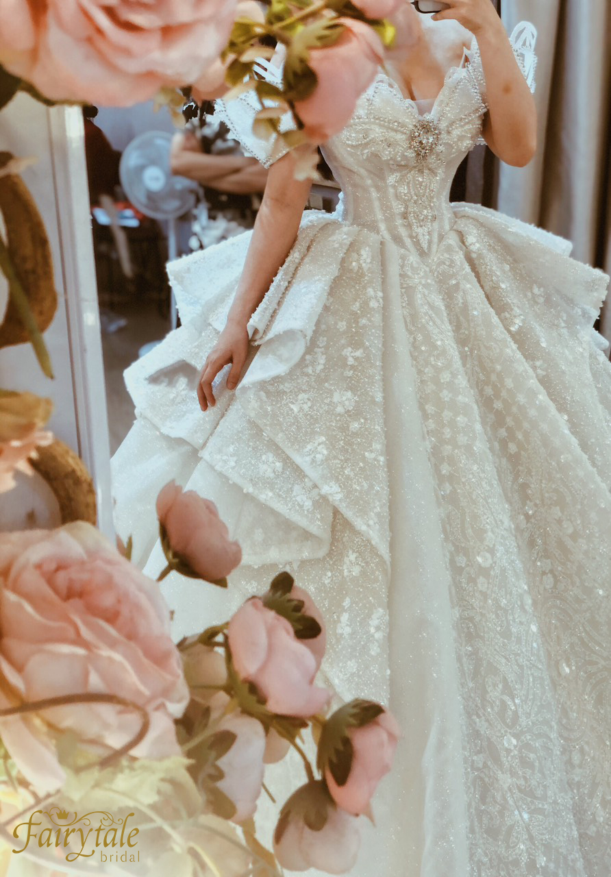 Với những dáng váy công chúa bồng xoè to, được sử dụng hoàn toàn chất liệu ngoại nhập kết hợp cùng kĩ thuật đính kết đá quý, pha lê cao cấp, mỗi chiếc váy của Fairytale Bridal đều được đánh giá cao về độ tinh xảo. Bên cạnh đó còn là kĩ thuật dựng form thân ngắn có nẹp eo corset tạo vòng eo con kiến “trong mơ” cho mỗi nàng dâu