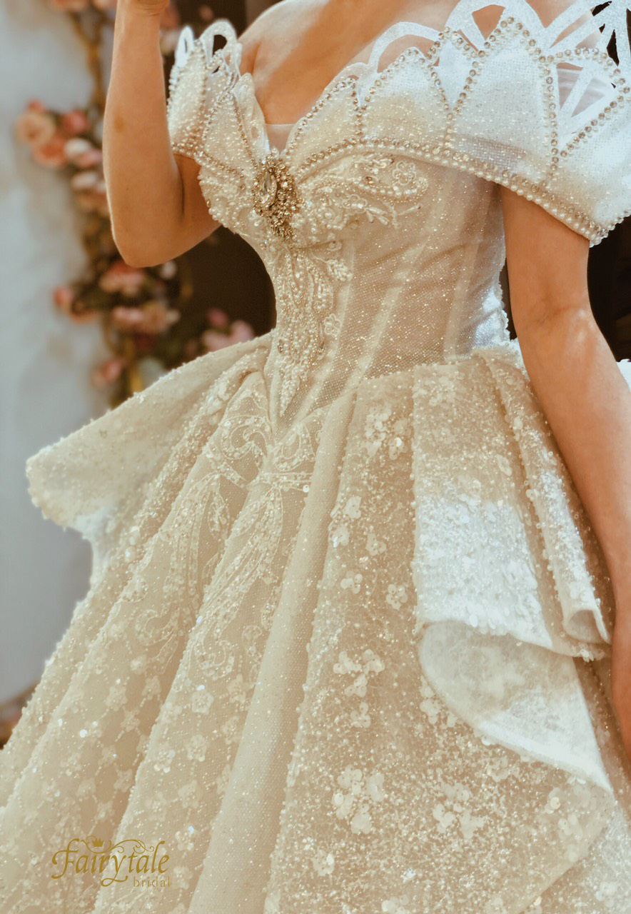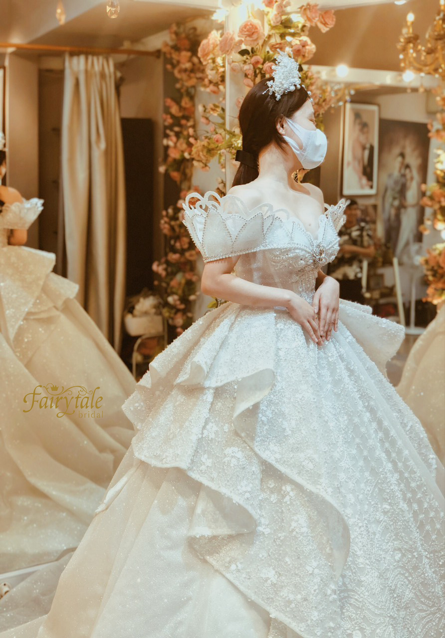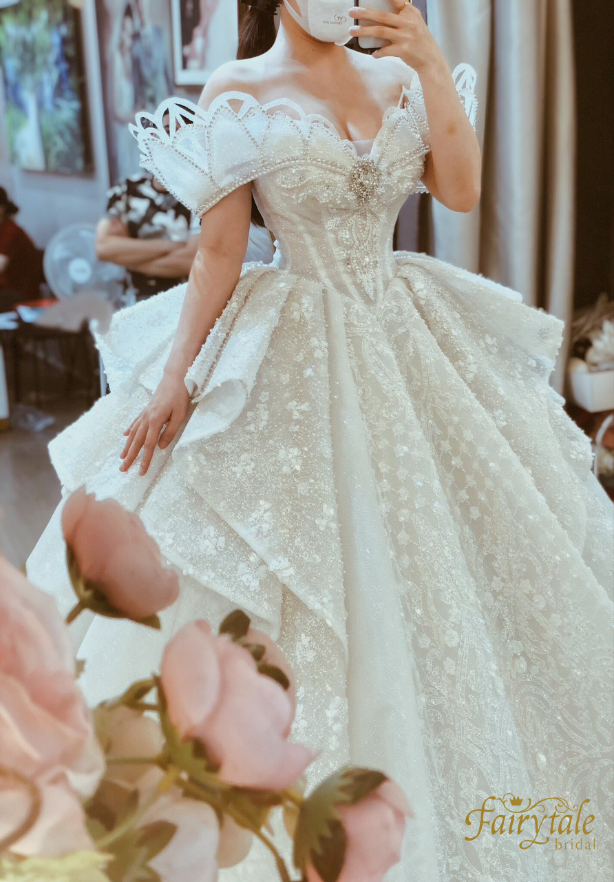 Với những dáng váy công chúa bồng xoè to, được sử dụng hoàn toàn chất liệu ngoại nhập kết hợp cùng kĩ thuật đính kết đá quý, pha lê cao cấp, mỗi chiếc váy của Fairytale Bridal đều được đánh giá cao về độ tinh xảo. Bên cạnh đó còn là kĩ thuật dựng form thân ngắn có nẹp eo corset tạo vòng eo con kiến “trong mơ” cho mỗi nàng dâu