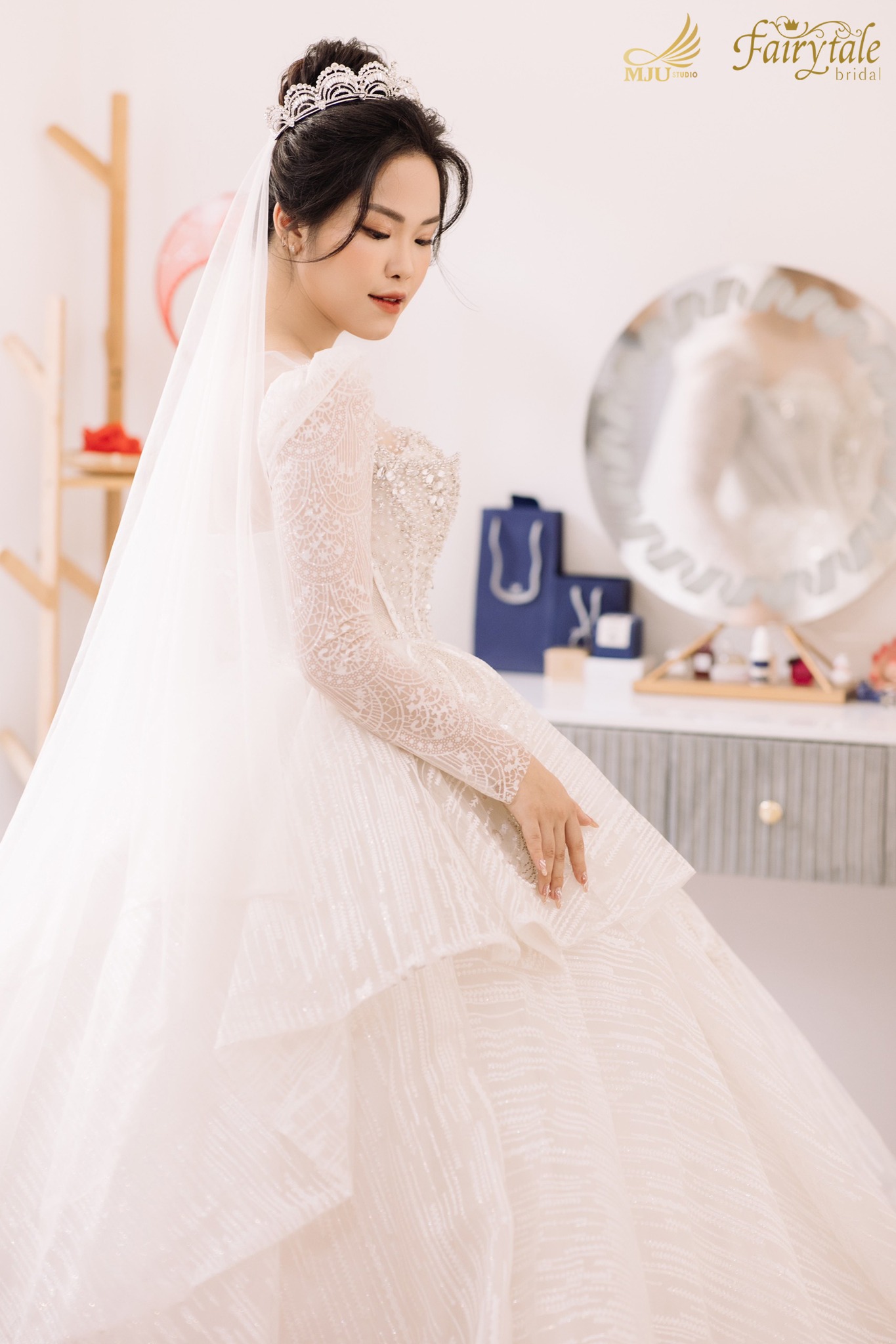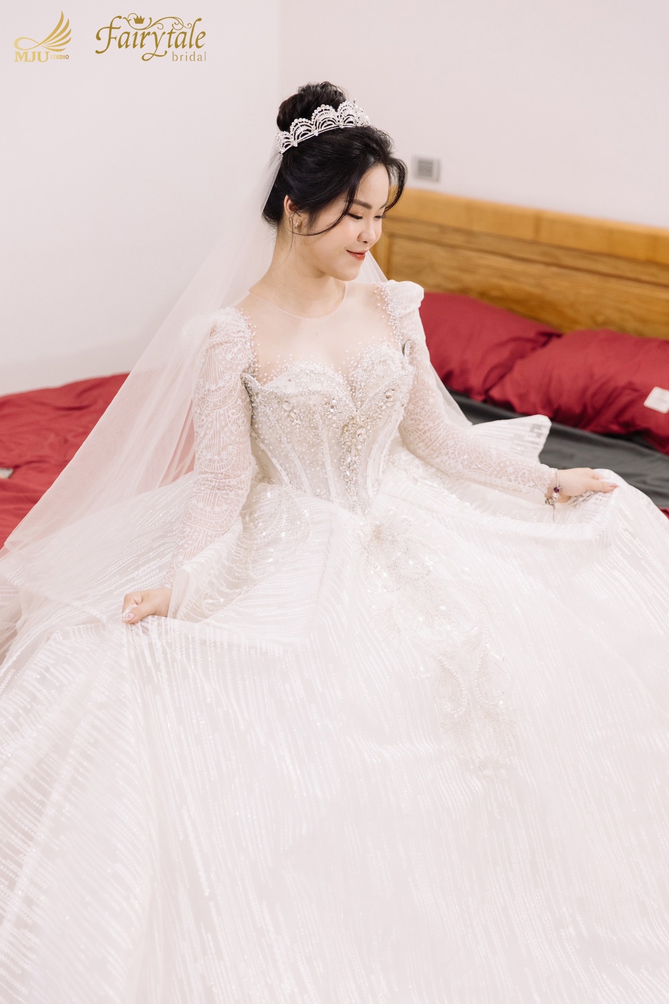 Với những dáng váy công chúa bồng xoè to, được sử dụng hoàn toàn chất liệu ngoại nhập kết hợp cùng kĩ thuật đính kết đá quý, pha lê cao cấp, mỗi chiếc váy của Fairytale Bridal đều được đánh giá cao về độ tinh xảo. Bên cạnh đó còn là kĩ thuật dựng form thân ngắn có nẹp eo corset tạo vòng eo con kiến “trong mơ” cho mỗi nàng dâu
