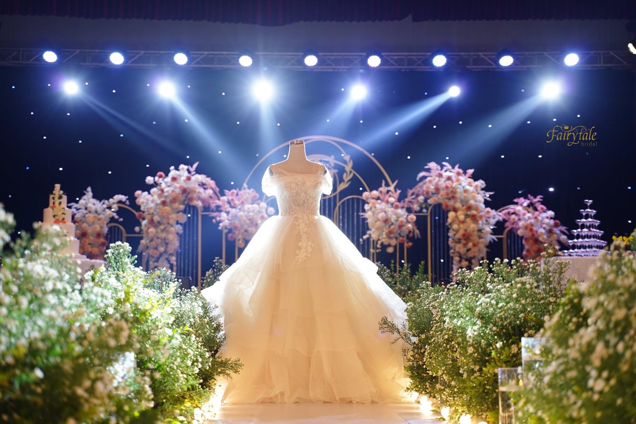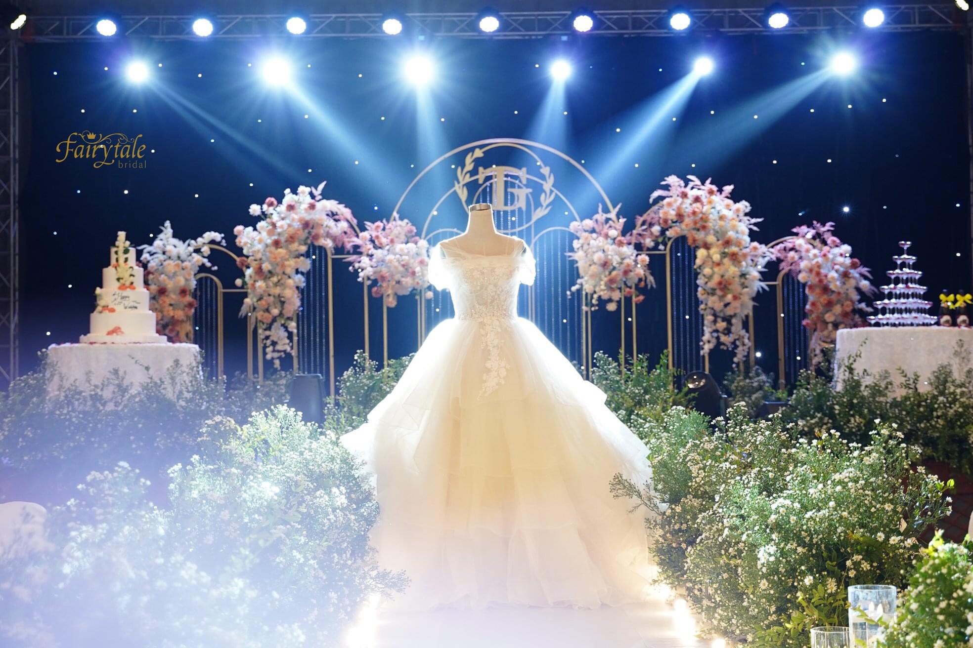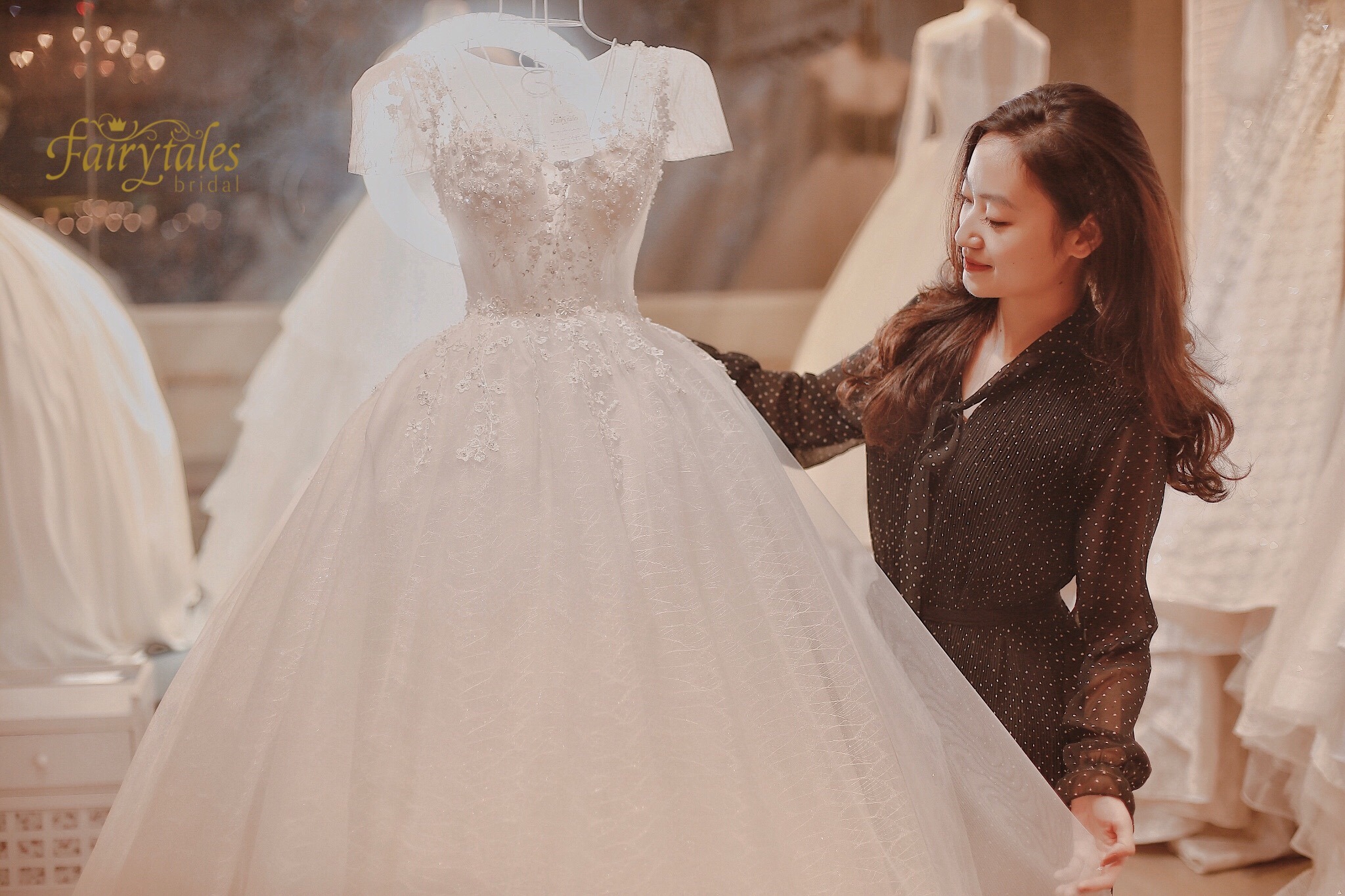 Với những dáng váy công chúa bồng xoè to, được sử dụng hoàn toàn chất liệu ngoại nhập kết hợp cùng kĩ thuật đính kết đá quý, pha lê cao cấp, mỗi chiếc váy của Fairytale Bridal đều được đánh giá cao về độ tinh xảo. Bên cạnh đó còn là kĩ thuật dựng form thân ngắn có nẹp eo corset tạo vòng eo con kiến “trong mơ” cho mỗi nàng dâu