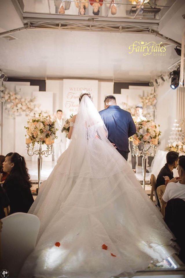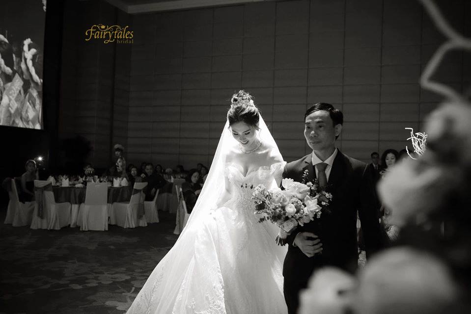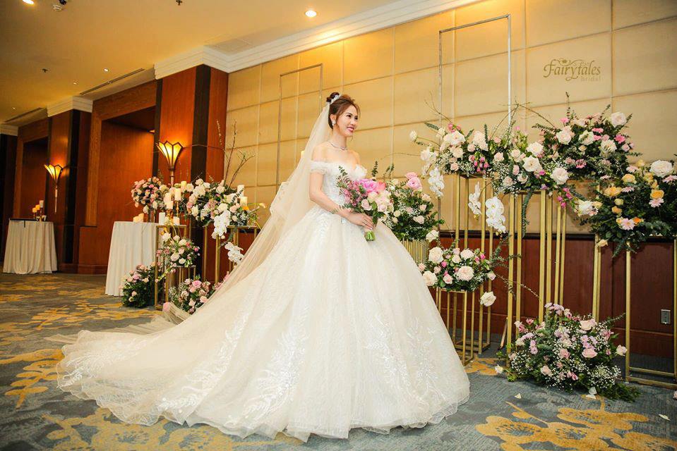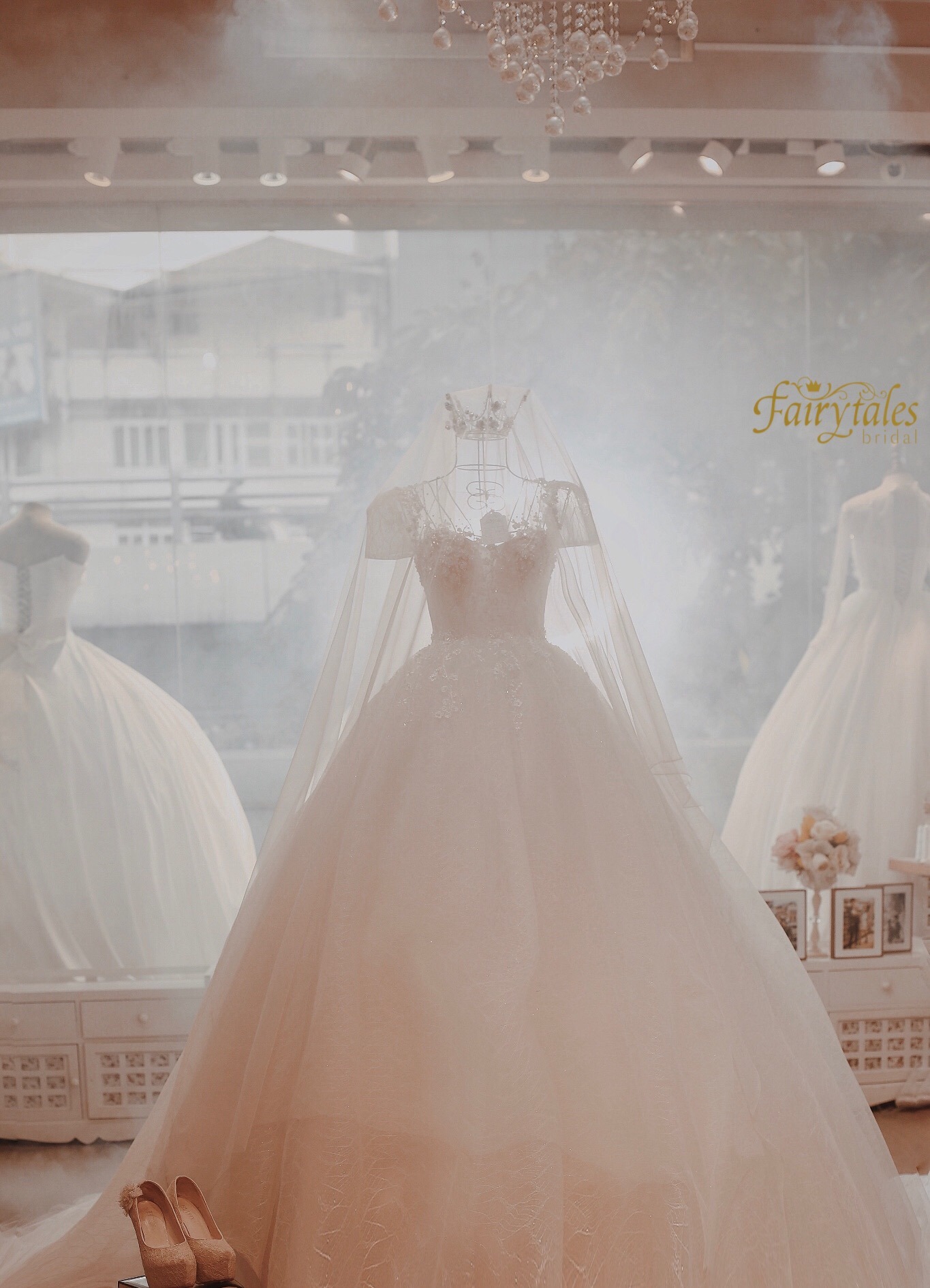Với những dáng váy công chúa bồng xoè to, được sử dụng hoàn toàn chất liệu ngoại nhập kết hợp cùng kĩ thuật đính kết đá quý, pha lê cao cấp, mỗi chiếc váy của Fairytale Bridal đều được đánh giá cao về độ tinh xảo. Bên cạnh đó còn là kĩ thuật dựng form thân ngắn có nẹp eo corset tạo vòng eo con kiến “trong mơ” cho mỗi nàng dâu