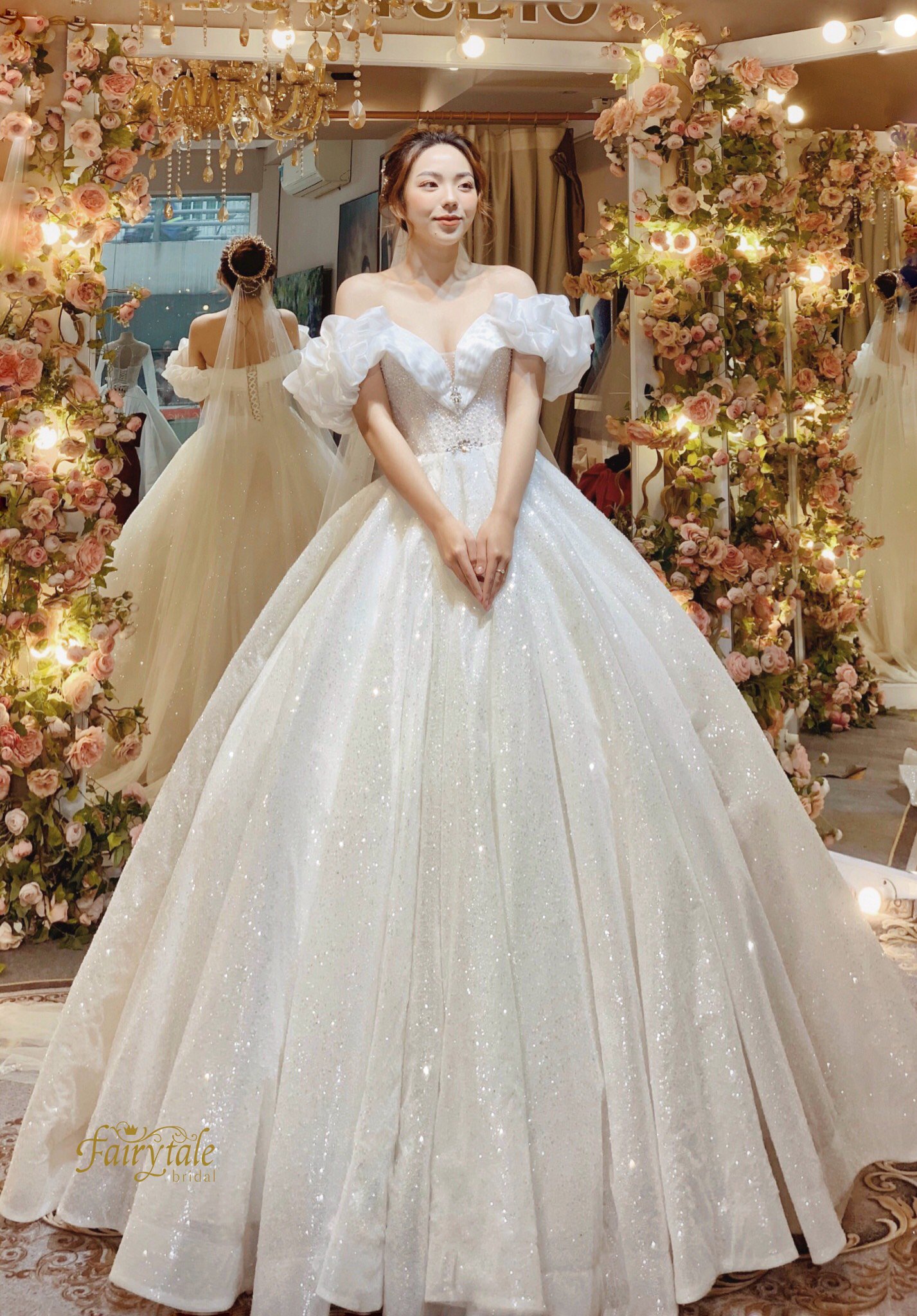 Với những dáng váy công chúa bồng xoè to, được sử dụng hoàn toàn chất liệu ngoại nhập kết hợp cùng kĩ thuật đính kết đá quý, pha lê cao cấp, mỗi chiếc váy của Fairytale Bridal đều được đánh giá cao về độ tinh xảo. Bên cạnh đó còn là kĩ thuật dựng form thân ngắn có nẹp eo corset tạo vòng eo con kiến “trong mơ” cho mỗi nàng dâu