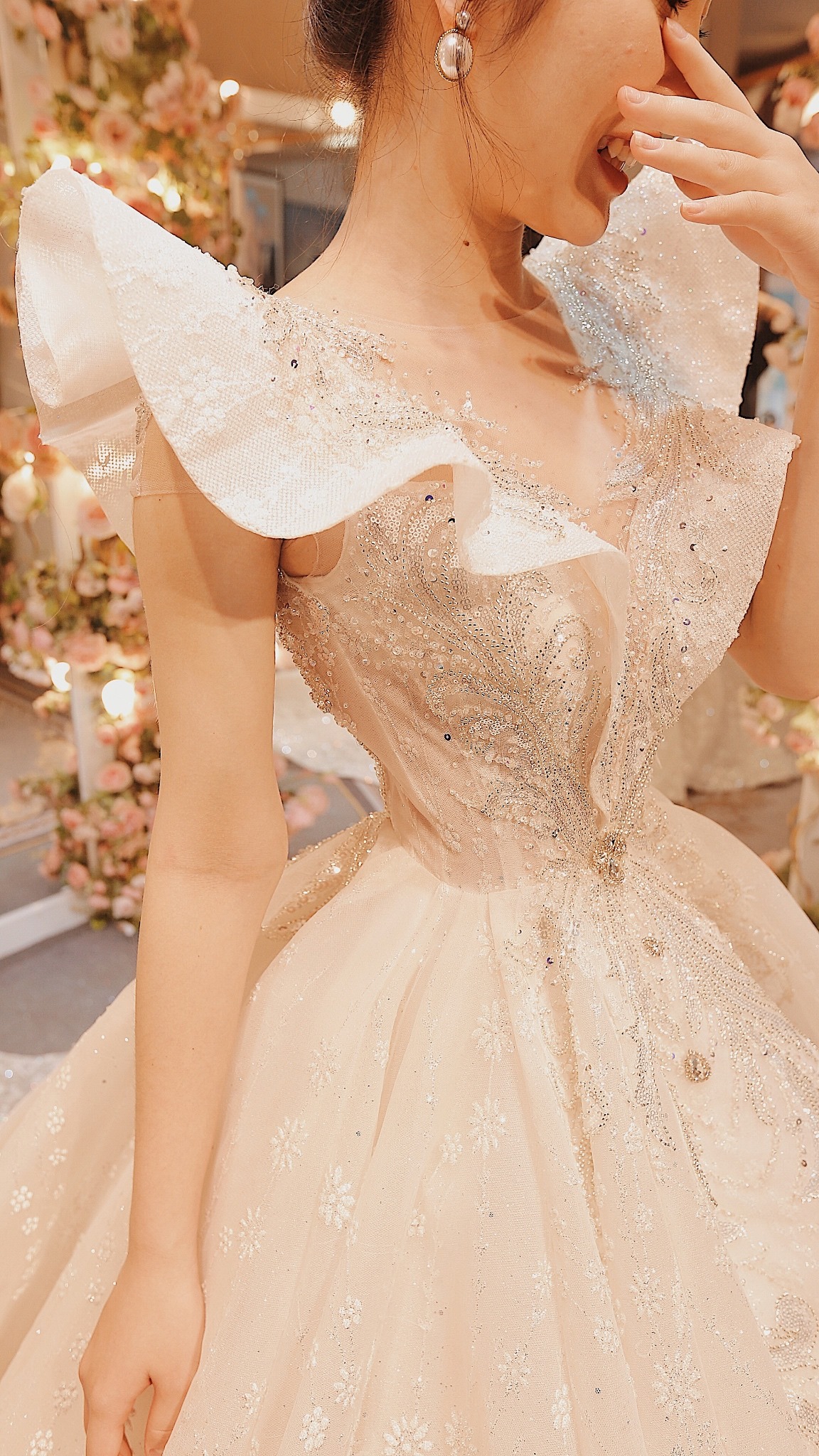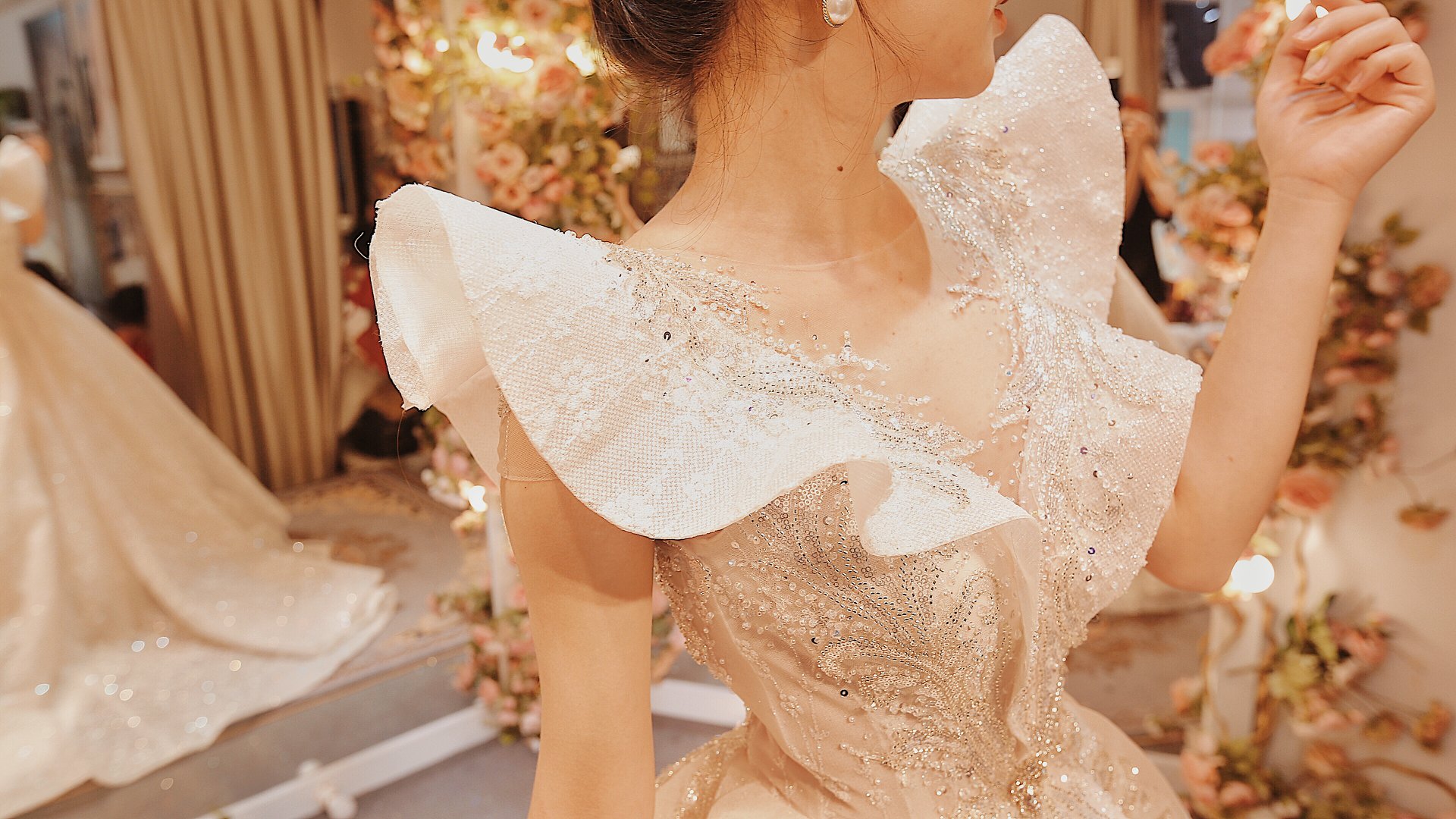 Với những dáng váy công chúa bồng xoè to, được sử dụng hoàn toàn chất liệu ngoại nhập kết hợp cùng kĩ thuật đính kết đá quý, pha lê cao cấp, mỗi chiếc váy của Fairytale Bridal đều được đánh giá cao về độ tinh xảo. Bên cạnh đó còn là kĩ thuật dựng form thân ngắn có nẹp eo corset tạo vòng eo con kiến “trong mơ” cho mỗi nàng dâu