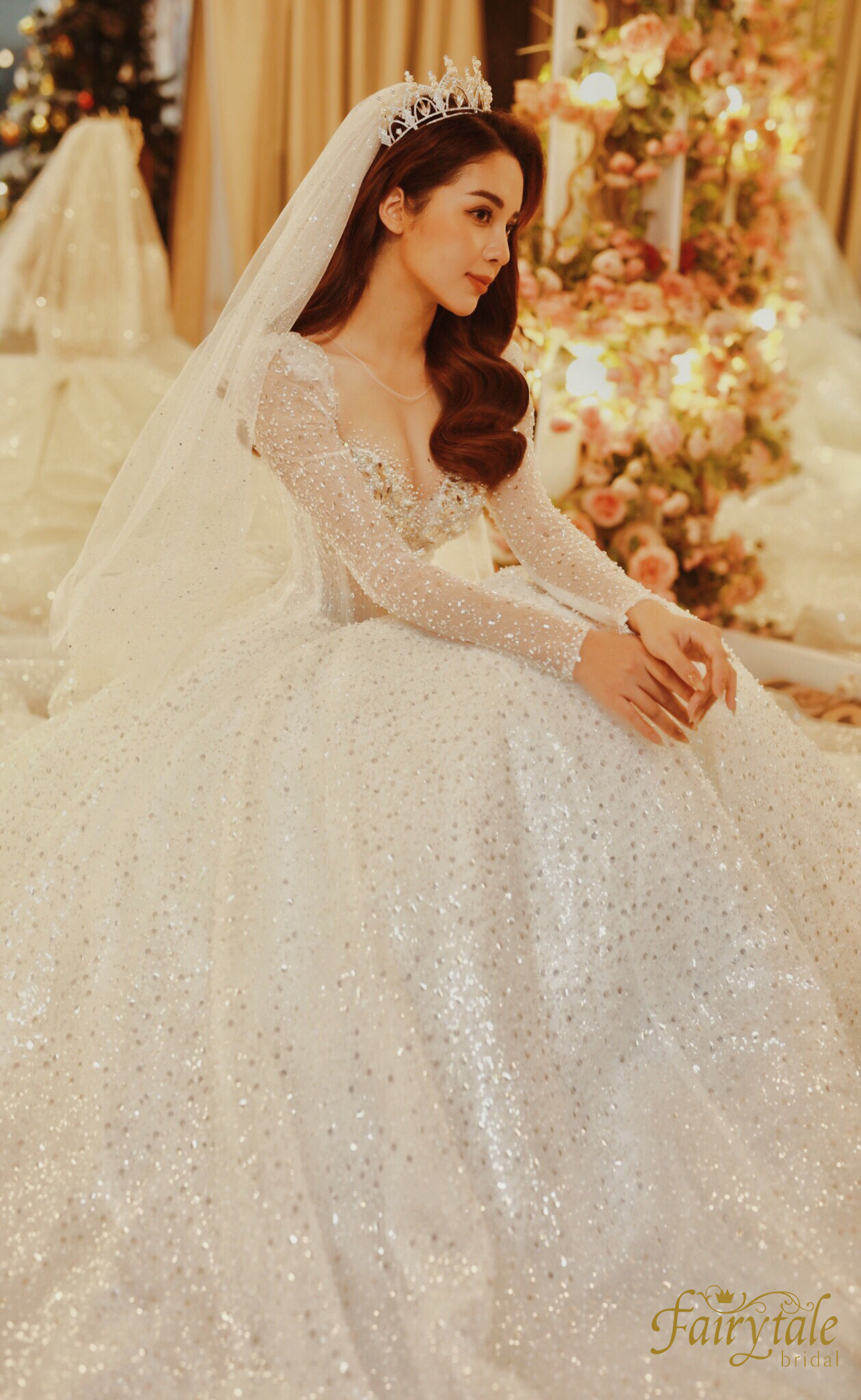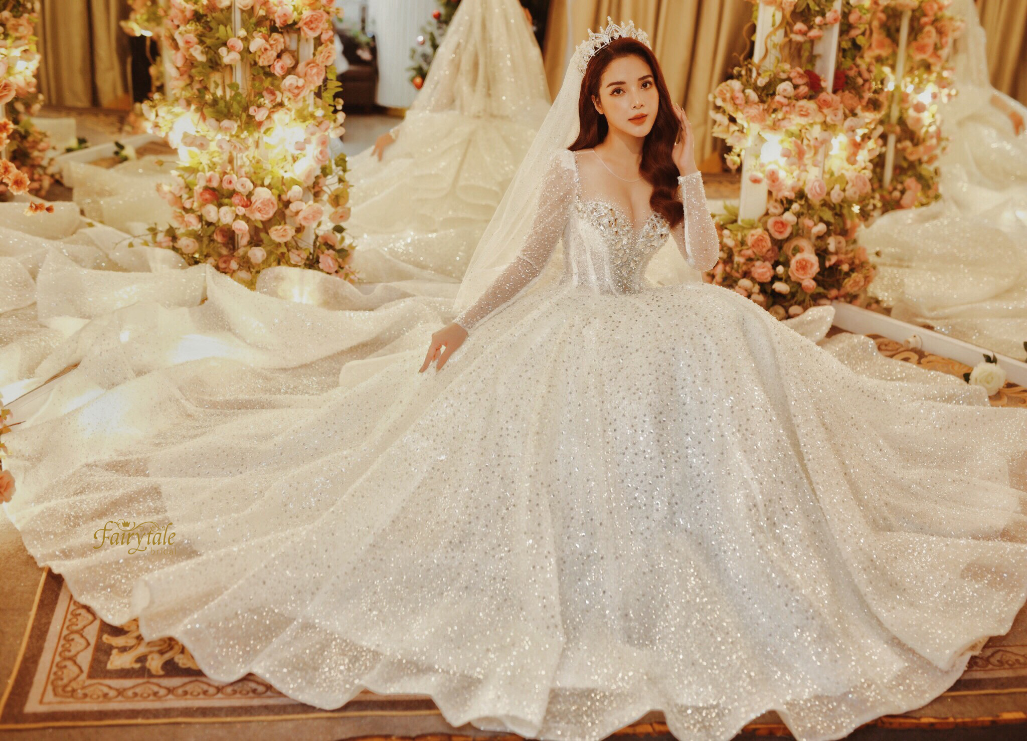 Với những dáng váy công chúa bồng xoè to, được sử dụng hoàn toàn chất liệu ngoại nhập kết hợp cùng kĩ thuật đính kết đá quý, pha lê cao cấp, mỗi chiếc váy của Fairytale Bridal đều được đánh giá cao về độ tinh xảo. Bên cạnh đó còn là kĩ thuật dựng form thân ngắn có nẹp eo corset tạo vòng eo con kiến “trong mơ” cho mỗi nàng dâu